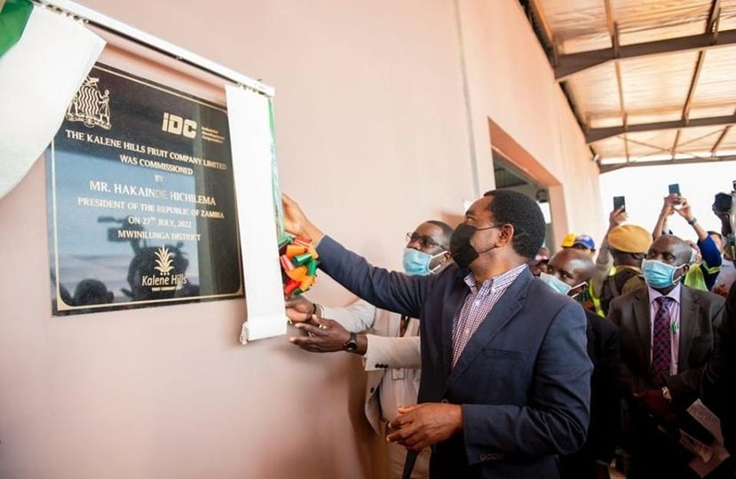 President Hakainde Hichilema has commissioned the K130 million Kalene Hills Fruits Company, the plant will process a variety of fruits and other farm produce such as beans, groundnuts and tomatoes using small scale farmers as suppliers.