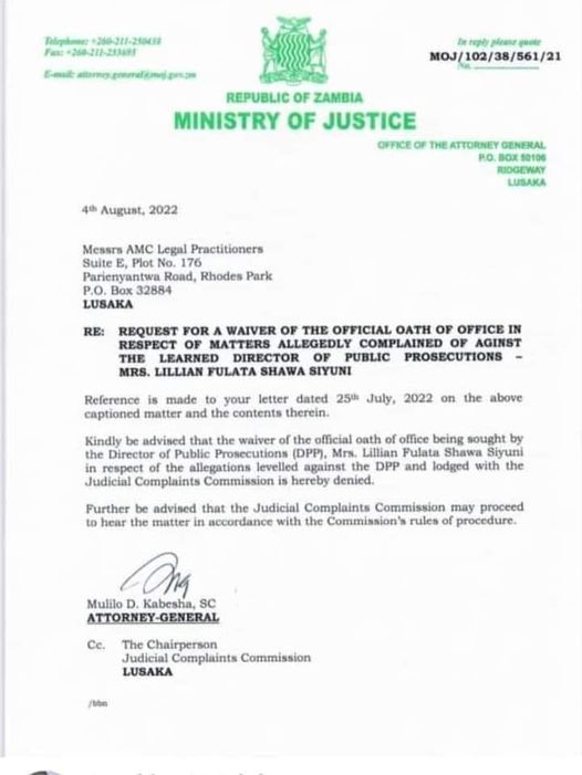 DPP Lillian Shawa-Siyuni’s request to have President Hakainde Hichilema to waive her oath of secrecy in order to defend herself on some of the allegations made against her has been rejected.