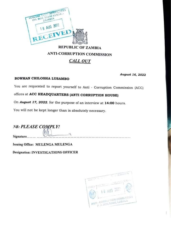 THE Anti-Corruption Commission (ACC) has summoned Hon. Bowman Lusambo for further questioning.