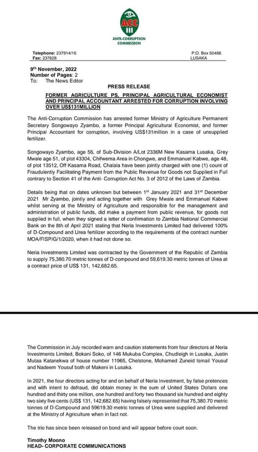 Share ACC has arrested former agriculture PS Songowayo Zyambo and others for corruption involving over $131 million. Post navigation GOVERNMENT TO PROBE DEATHS OF CORRECTIONAL SERVICE RECRUITS NO GRADE 12 EXAMINATION FEES – THABO KAWANA