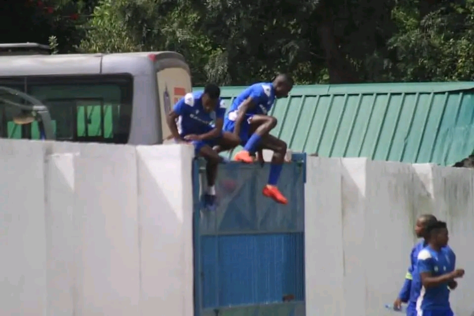 Lumwana Radiants FC players are captured at the Edwin Imboela Stadium in Lusaka after they refused to pass through the dressing tunnel and decided to jump over the Gate believing that their was “juju” placed for bad luck minutes before kick off as they faced Zambia army sponsored side Green Buffaloes.
