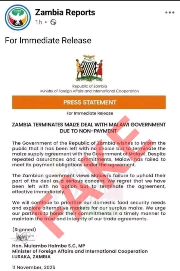 Zambia Reports management has been made aware of a photoshopped picture bearing our logo and name, suggesting that we posted a statement to the effect that the Government of the Republic of Zambia has cancelled its maize “deal with Malawi due to non-payment”.
