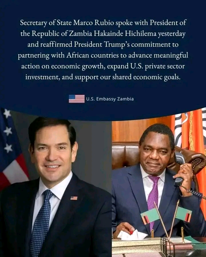 US embassy in Zambia writes..Yesterday, Secretary of State Marco Rubio spoke with President of the Republic of Zambia Hakainde Hichilema and reaffirmed President Trump’s commitment to partnering with African countries to advance meaningful action on economic growth, expand U.S. private sector investment, and support our shared economic goals.