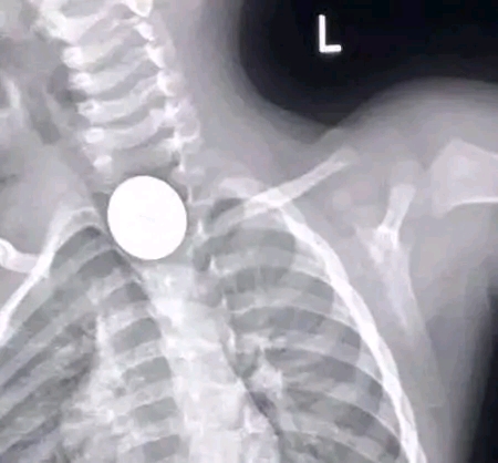 He vomited twice in ER, but was not in Respiratory distress. His Vital Signs were stable, and no abnormalities were detected.X-ray was done and confirmed a Diagnosis of foreign body in Oesophagus.