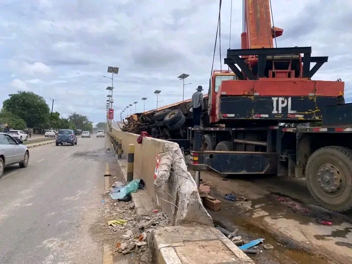 According to eyewitnesses, a tipper truck loaded with quarry, which was heading into Lusaka CBD from the south, slid on a bridge and overturned.