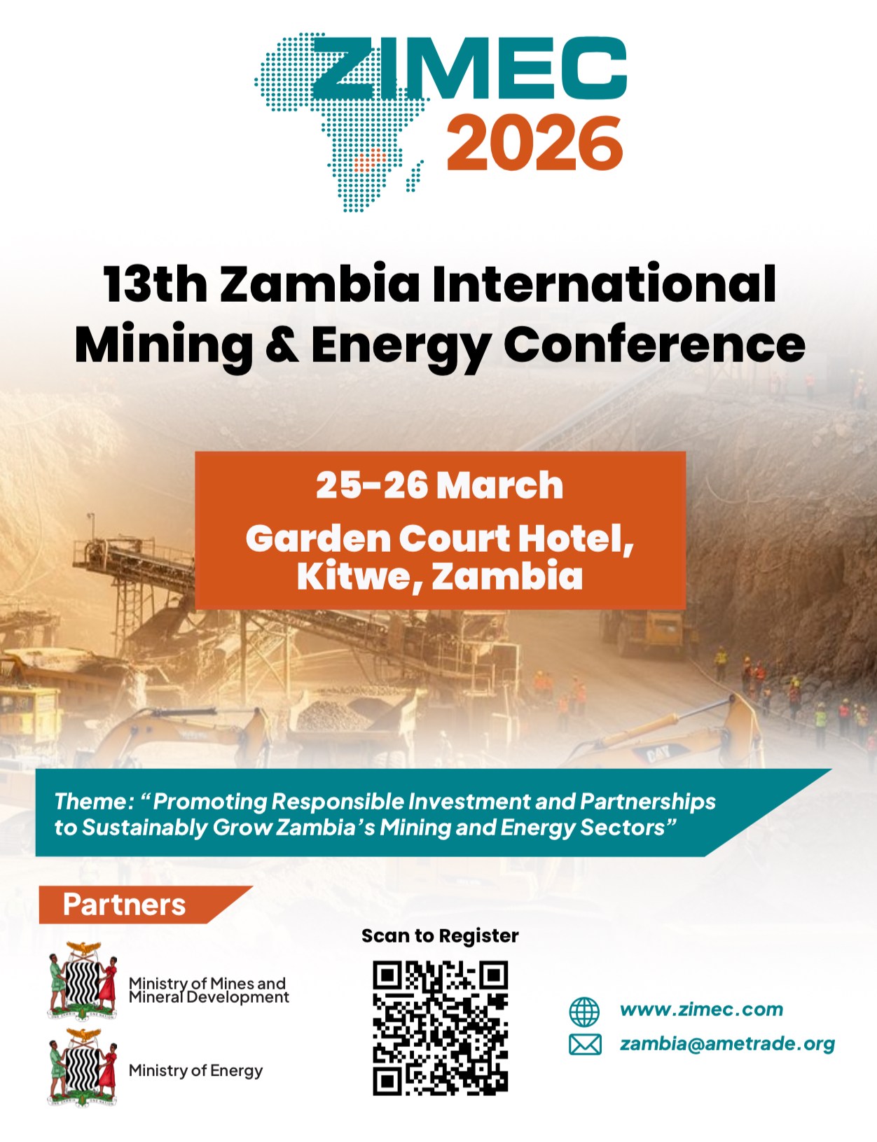 As Zambia advances ambitious targets across mining production, energy reform, and regional trade integration, the 13th edition of the Zambia International Mining and Energy Conference and Exhibition (ZIMEC 2026) will convene policymakers, industry leaders, financiers, and technical experts to examine how the country can translate momentum into long-term, sustainable growth. ZIMEC 2026 will take place at the Garden Court Hotel, in Kitwe at the heart of the Copperbelt from 25 – 26 March 2026.